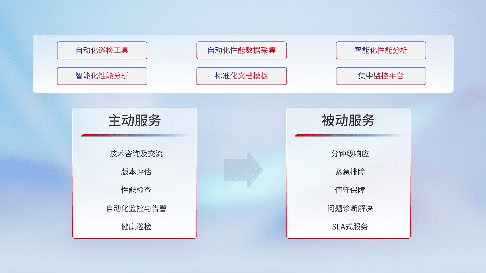 智能化工具和标准化文档,,,,保障服务质量,,,,提供主动服务(包含技术咨询、、、版本评估、、性能检查、、、、自动化监控与告警、、、健康巡检)和被动服务包含(分钟级响应、、紧急排障、、、值守保障、、、、问题诊断解决、、、、SLA服务)。。。。